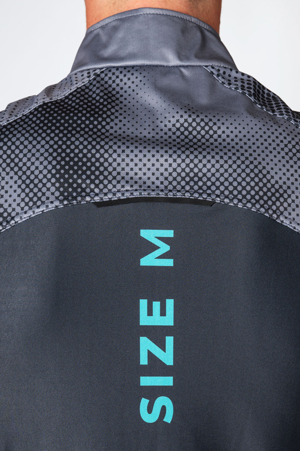 The running and racing gilet in a semi-fitting design is ideal especially as a men’s or unisex version. It is made in combination of two materials: the main part from lightweight three-layer membrane Zerowind material that is resistant to wind and moisture. Middle back part is made from stretch and soft Roubaix material offering better breathability and full range of motion. Gilet is anatomically shaped with a full length zip with covers at both ends and two zip pockets at the front. Armholes are hemmed with elastic and bottom hem is without elastic. Front and back panel is equipped with reflective details. Chest zip pocket or back pockets can be added at your request together with your own design on the grey areas as seen n the picture.