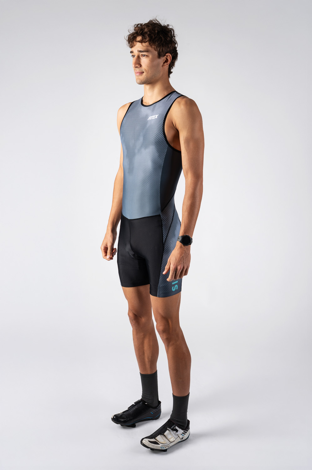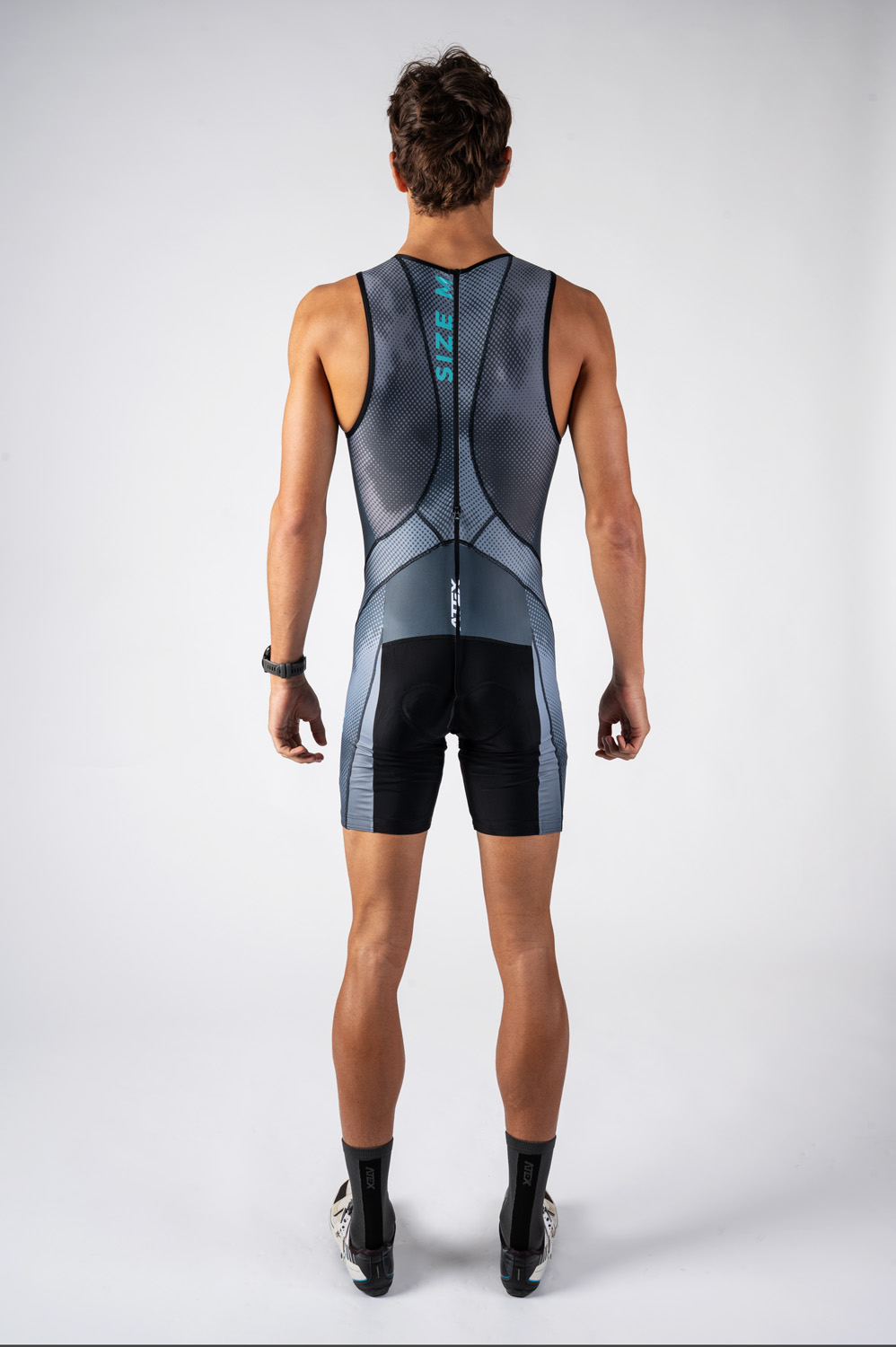 The triathlon suit Elite without sleeves comes in its basic version with non-slip elastic, front part with underlaid zip with a cover, back panel in webbed material for better ventilation and drying. Furthermore the suit includes top-quality Triathlon pad and double pocket at the back. Double pocket can be replaced with a zip pocket. Zip can be also moved to the back. Reflective details and your print on grey areas as seen in the picture can be added at your request.