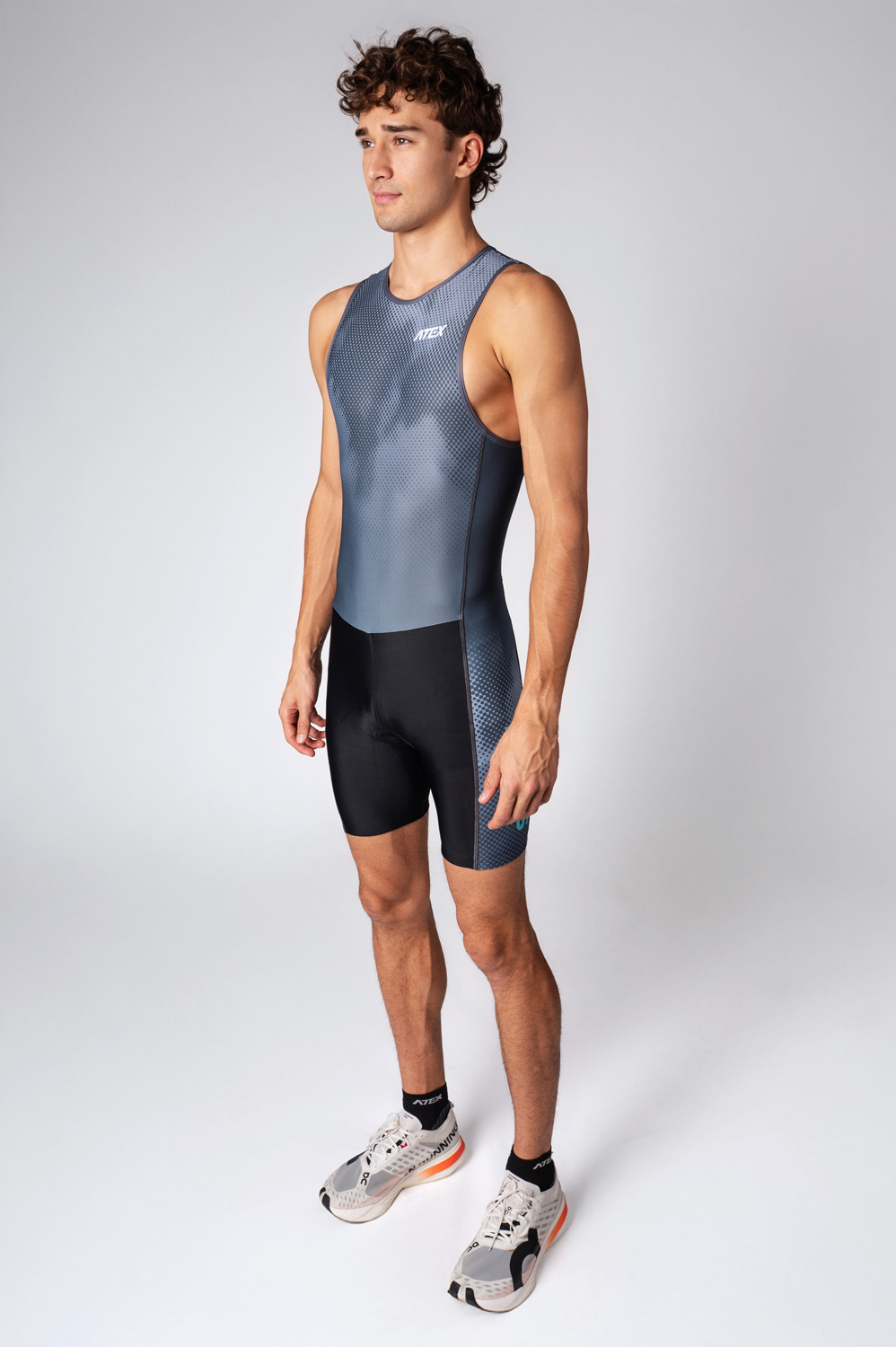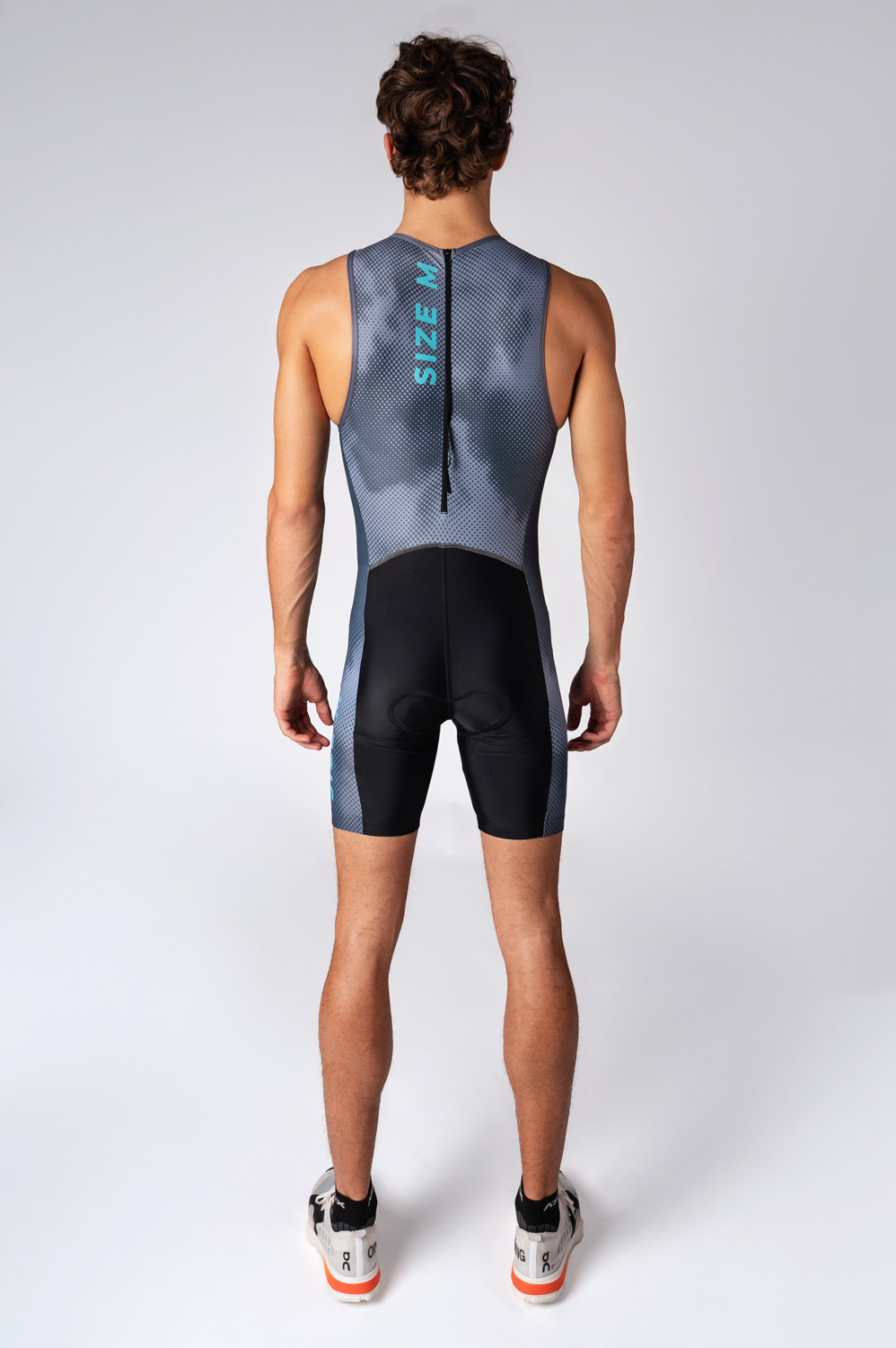 The basic model of triathlon sleeveless suit Profi offers short trouser legs with an elastic leg gripper. Underlaid zip with cover on the front panel and high-quality triathlon pad. Zip pocket on the back panel and reflective details can be added at your request. Grey areas as shown in the picture can be printed on.