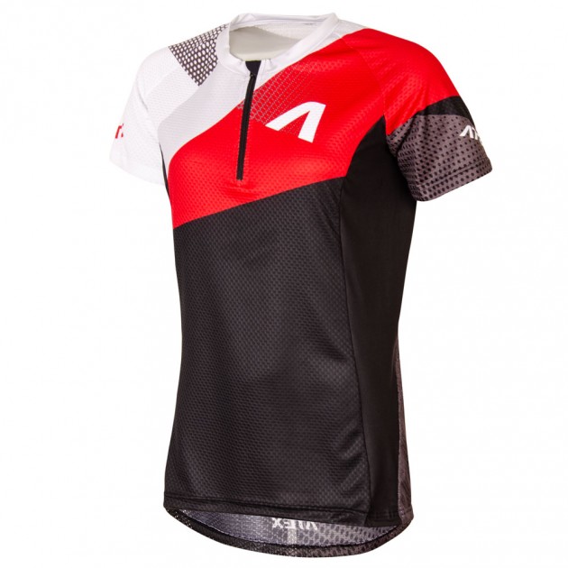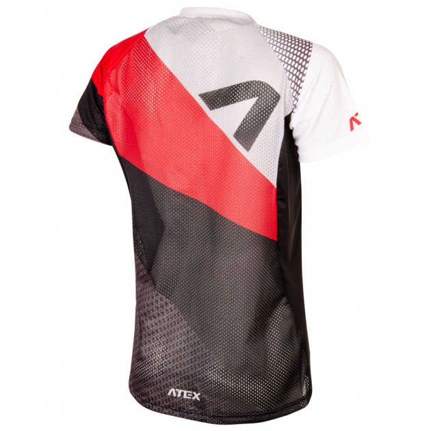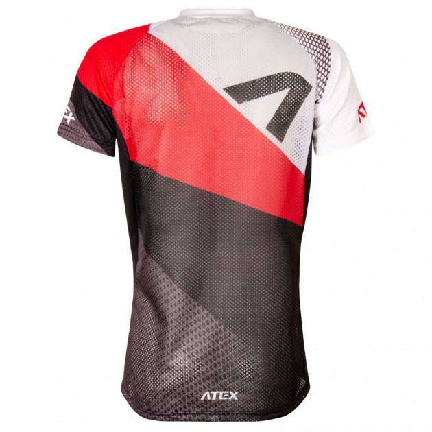 The jersey has a short zip on the front panel with a lock down system and a cover. The neckline is round and with a small hem. Short raglan sleeves and sleeve cuffs together with bottom hems are turned up without elastic. Seams in the underarm areas are almost none and invisible. These panels thanks to their placement and round shape increase comfort of a sportsman while running to the maximum.